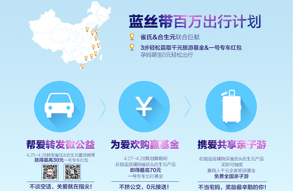 在中國,每天新增216000位新媽媽。在分娩前,她們至少需要奔波20多個來回進行產檢;在學齡前,他們至少需要帶寶寶接種22次疫苗。雀氏通過對孕婦及媽媽們日常生活的考察,發現這一特殊群體日常出行時的不便利,針對這一特殊群體的特殊時期的痛點切入,提出“幫愛出行”的公益理念。首次跨界聯合四大品牌,推出“2015藍絲帶百萬出行計劃”,呵護寶寶,更關注媽媽,給予媽媽與準媽媽們更多生活點滴的關注與關愛,共同保護生命中最重要的人。