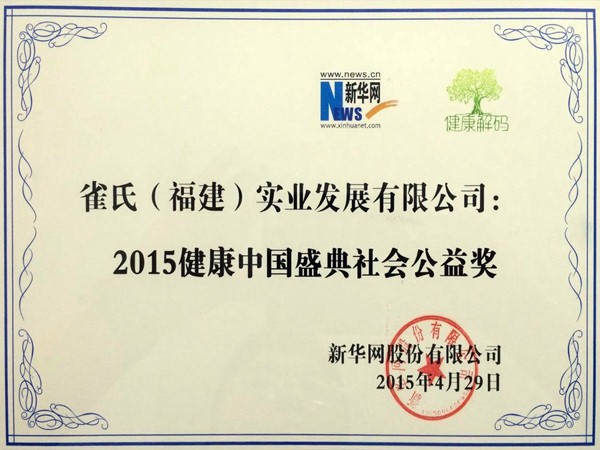 2015年,雀氏榮獲中國老年保健協會理事單位、中國老年保健協會成立二十周年突出貢獻獎。