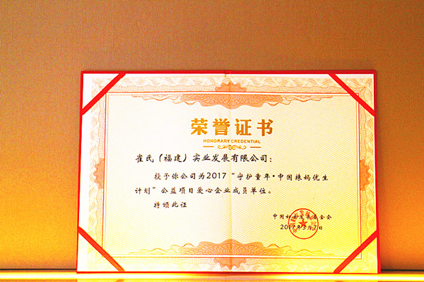 (雀氏集團榮獲中國婦女發展基金會頒發的愛心企業證明)