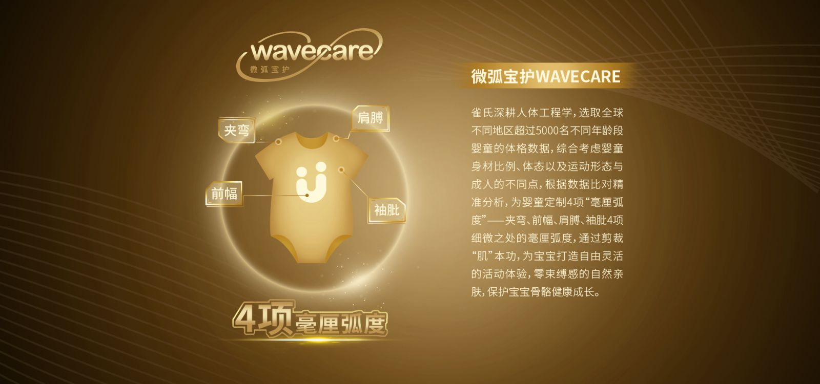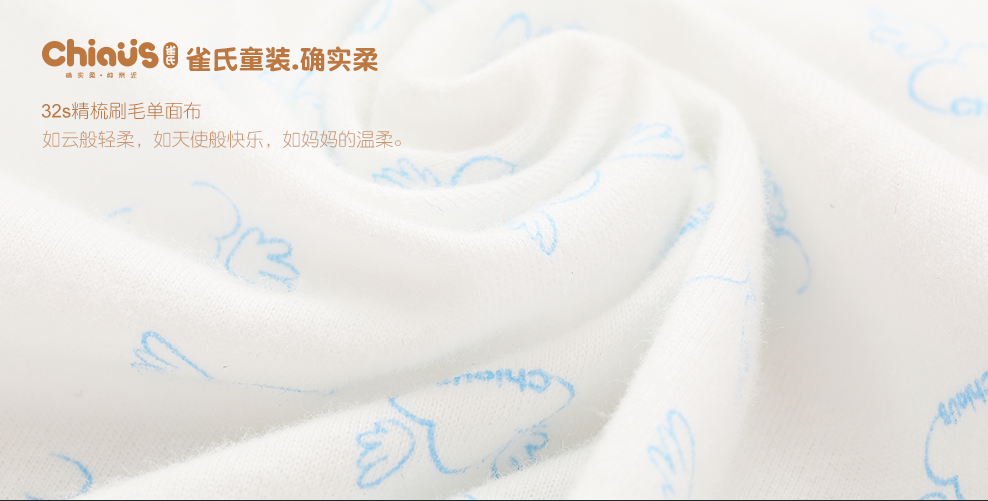 雀氏童裝是一個專門為0-3歲嬰童打造舒適童裝的服飾品牌,沿襲了雀氏制造紙尿褲的嚴苛標準,以更細致的關愛理念、更科學的研發精神,精心出品每一件童裝,這些已在選材上一一體現。雀氏童裝最大的特點就是“柔”,甄選純天然新疆長絨棉,每日陽光曬足16個小時,纖維長度長達33-46MM,帶來純天然柔軟觸感,給寶寶最親近貼心的呵護。除了選材用心,雀氏童裝研發團隊多年來深入貼近寶寶和媽媽的日常生活,經過一系列復雜嬰幼兒成長階段的數據分析后,獨家推出了“微弧寶護Wavecare”核心技術。針對童裝的夾彎、前幅、肩膊、袖肶定制4項“毫厘弧度”,符合人體工學設計,讓每一道弧線完美貼合寶寶肌膚。