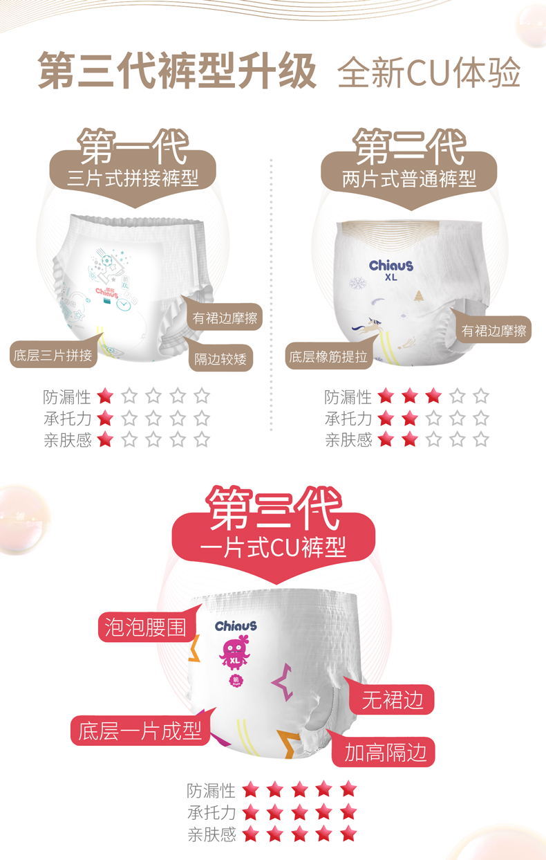 結合初代“三片式拼接褲型”及二代“二片式褲型”的研發經驗,這一次,雀氏于業內率先推陳出新,圍繞“防漏性”“承托力”“親膚感”3項核心指標升級產品,一面凸顯品牌“新”意,一面為媽媽和寶貝的生活注入愛與驚喜。