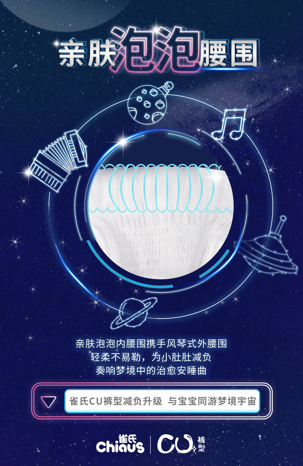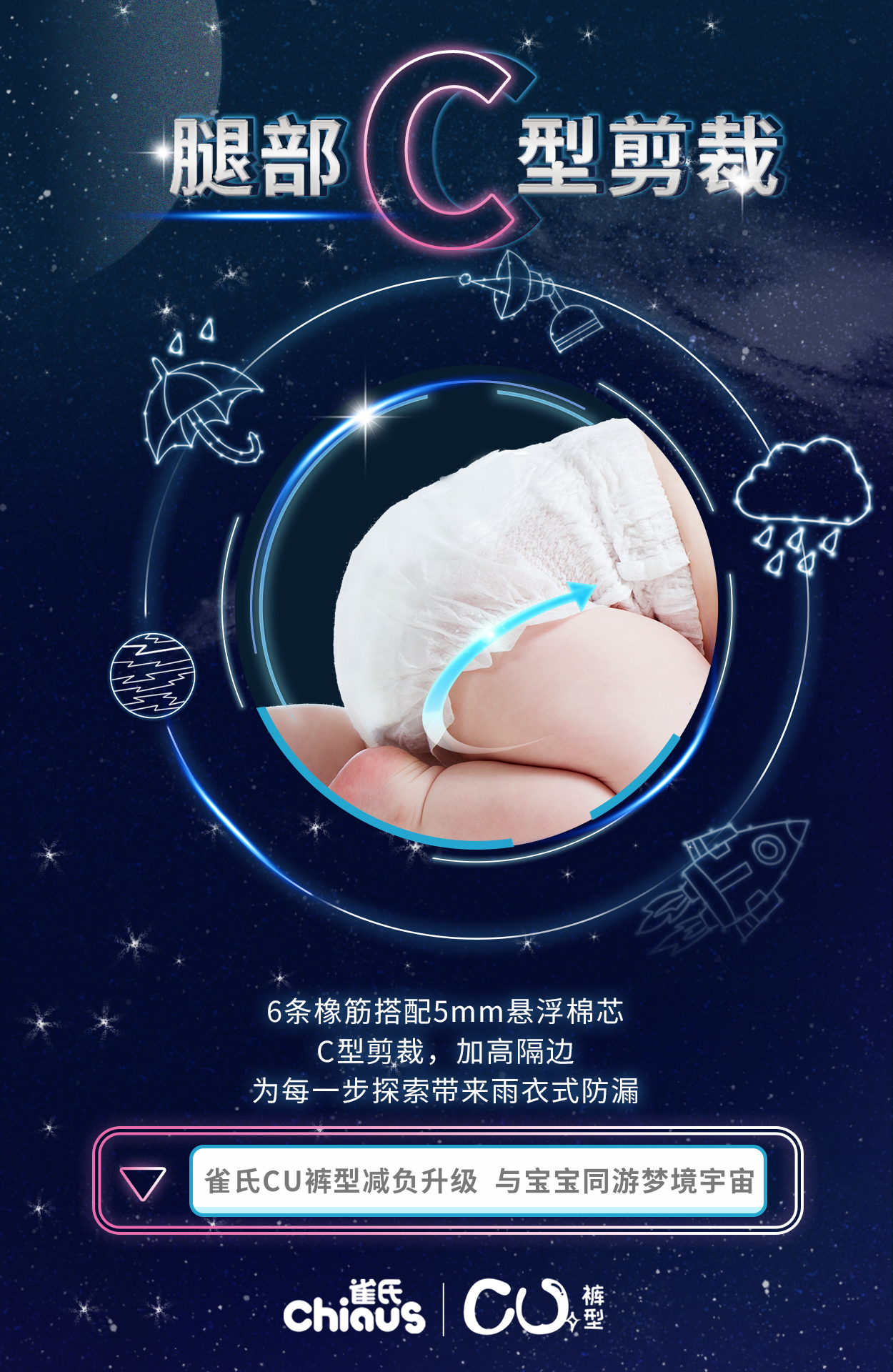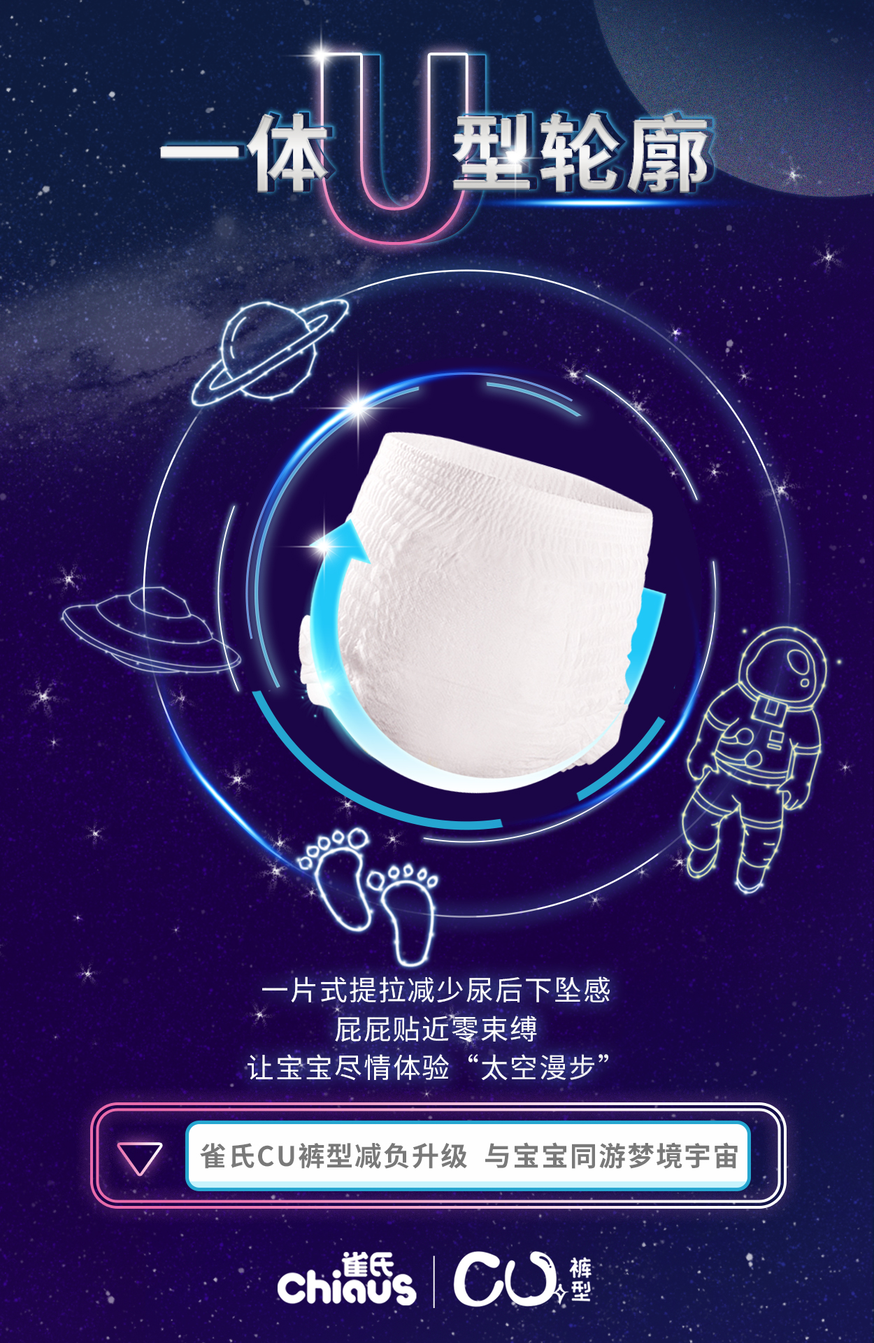 簡言之,C型裁剪 + U型輪廓,組合起來便是“雀氏CU褲型”——升級后的褲型命名,不僅方便消費者記憶,更完美詮釋出其獨特的銷售主張。其三大設計亮點,每一項都在為寶寶舒適生活加Buff,讓寶寶在其人生首次探索世界的過程中,能隨心而動,免受“屁事”干擾。