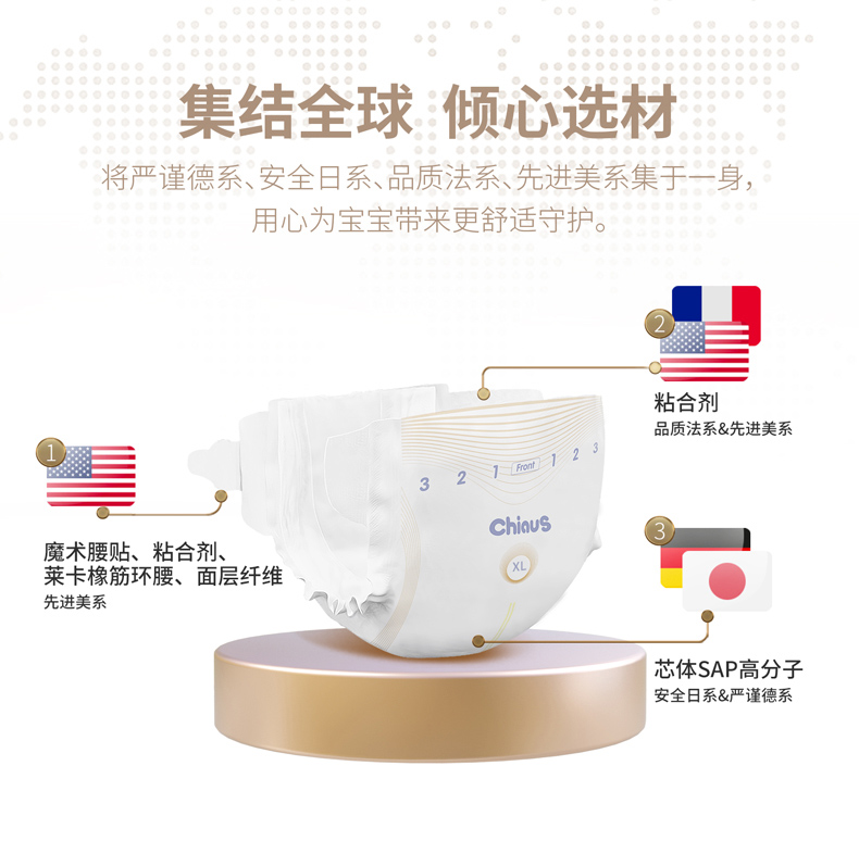 雀氏CU褲型以日本及德國的SAP高分子芯體、美國的魔術腰貼及面層纖維、法國的粘合劑等做產品原材料,集多國先進的技術優勢于一身,精細加工,贏得市場認可。