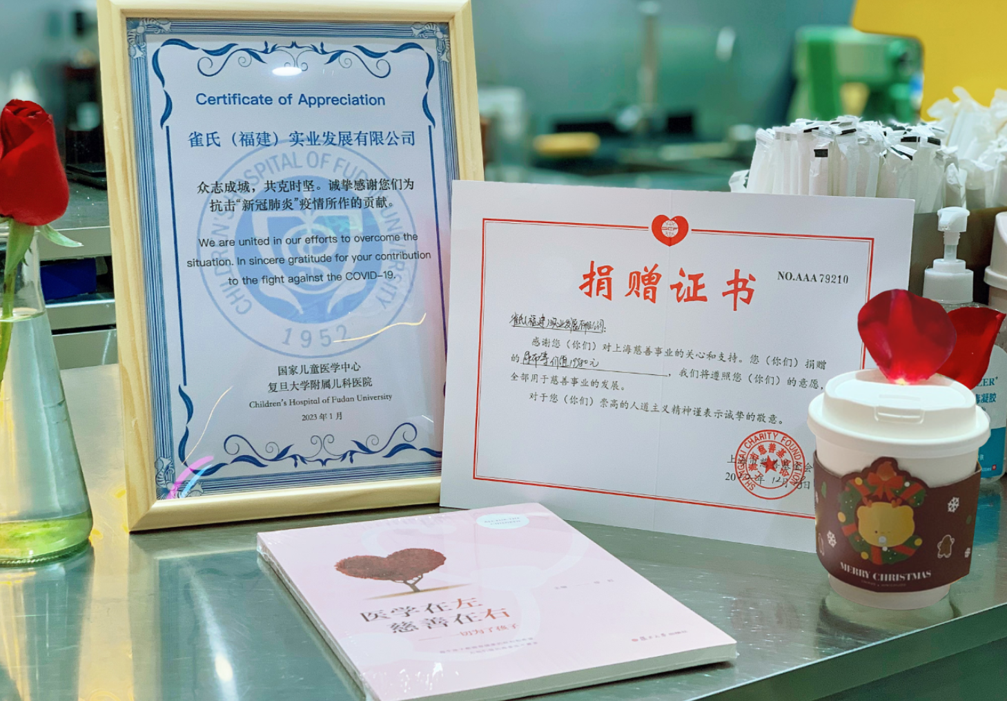 2023年1月,雀氏聯合上海熊爪咖啡及上海市慈善基金會,發起了“暖冬公益計劃”,向復旦大學附屬兒科醫院捐贈愛心產品,為貧困家庭的重癥幼兒送去暖心援助,向辛勤的醫護人員傳遞了最誠摯的關懷。