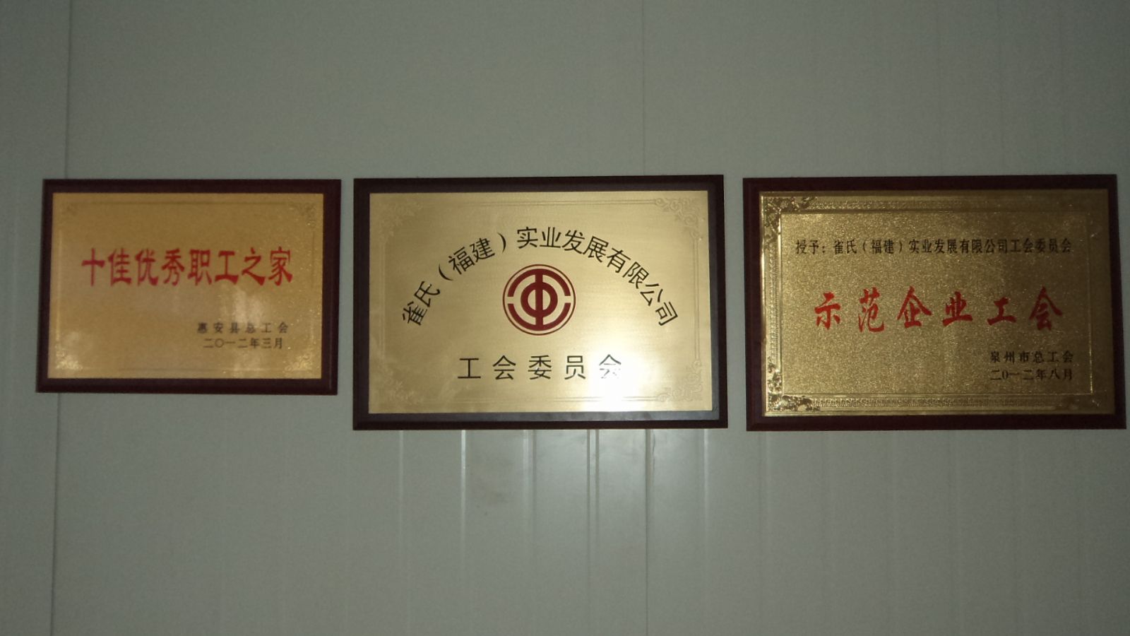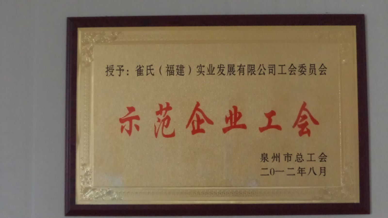 2012年8月雀氏工會榮獲泉州市總工會頒發的“泉州市示范企業工會”。全市僅50家非公有制企業工會獲此殊榮,市總工會對于我們的工作肯定,我們一定再接再厲,創造更好的成績,在職工和企業之間搭建良好的溝通橋梁,為企業的和諧發展做出更大的貢獻。