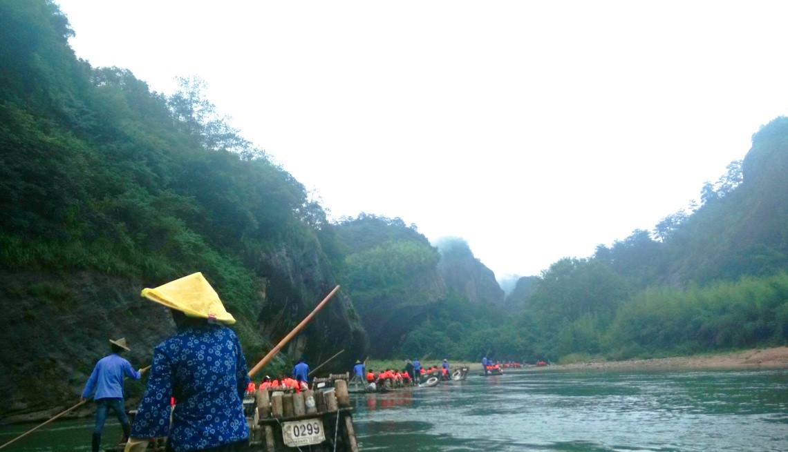 此行第一站,就是聞名世界的九曲溪風景區,乘九曲溪竹筏漂流九曲十八彎、山光倒影漣漪、環繞著武夷山三十六峰順流而下,九曲溪流水由西向東,蜿蜒自如,山挾水轉,水貫山行,溪水澄清,巖峰凝紫,真可謂曲曲含異趣,灣灣藏佳景,山聳千層青翡翠,溪搖萬頃碧琉璃"。清澈的九曲溪是武夷山風景區的靈魂,美不勝收,讓人忍不住感嘆一句:船在水中走,人在畫中游,見到如此良辰美景,往日的工作中辛苦疲憊也一掃而空了。