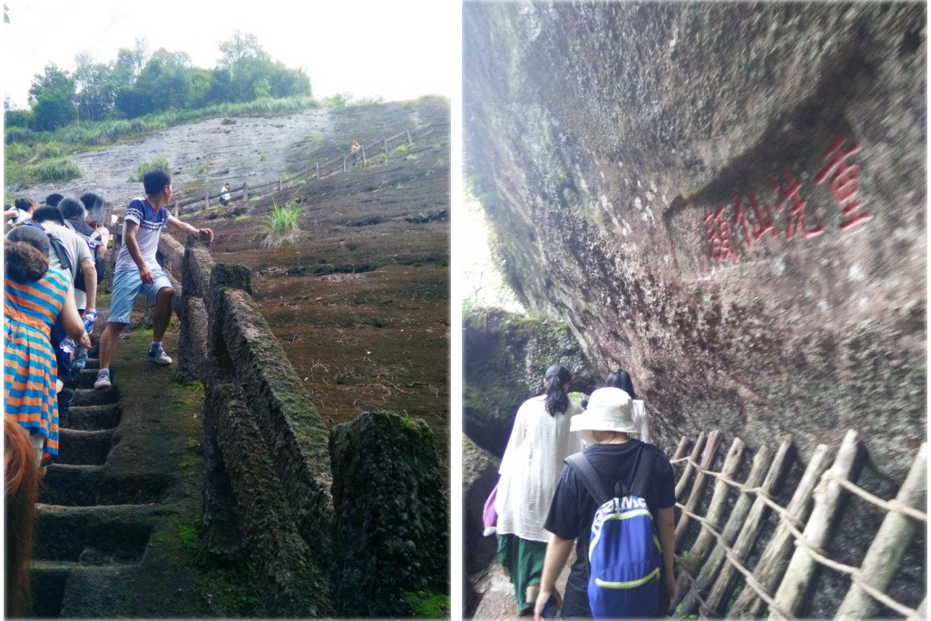 一線天風景區了,是武夷山最具挑戰性的景點,由于整個路線呈攀爬姿勢,不到最后出口并不能感覺到盡頭。最窄的地方只能側著身緩緩挪動,伸手不見五指,僅能靠巖壁上景區管理處安裝上的小燈辨別出腳下的階梯,而身形稍微肥胖的游客甚至要“貼”在墻面上,挪動時能感受到仿佛兩面巖壁在擠壓著身體。游客們在此處經常會害怕其實最黑暗的時刻就代表著光明即將來臨。過了那段0.3米的“驚險”通道,就已經能見到微弱的陽光,再往上攀爬過幾個大階梯,就是武夷山一線天的盡頭處了。走出一線天洞口,見到陽光下武夷山的奇峰怪石,仿佛是獲得了新生一般,心底有一種對生命的無限喜悅。