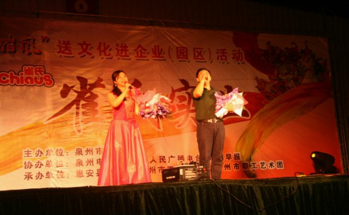 2012年4月24日晚,由福建省泉州市總工會主辦,泉州市電視臺、泉州人民廣播電臺、東南早報協辦,惠安縣總工會、泉州市工人文化宮、泉州市職工藝術團承辦的“歡樂泉州,和諧風”送文化進企業——走進雀氏(福建)實業發展有限公司,福建省泉州市職工藝術團的文藝工作者以及雀氏公司的文藝骨干為公司全體職工送上一道豐盛的文化大餐。泉州市總工會領導、縣領導、縣總工會領導,公司總經理陳建義、涂寨鎮領導與雀氏的1000多名職工一同觀看了晚會。